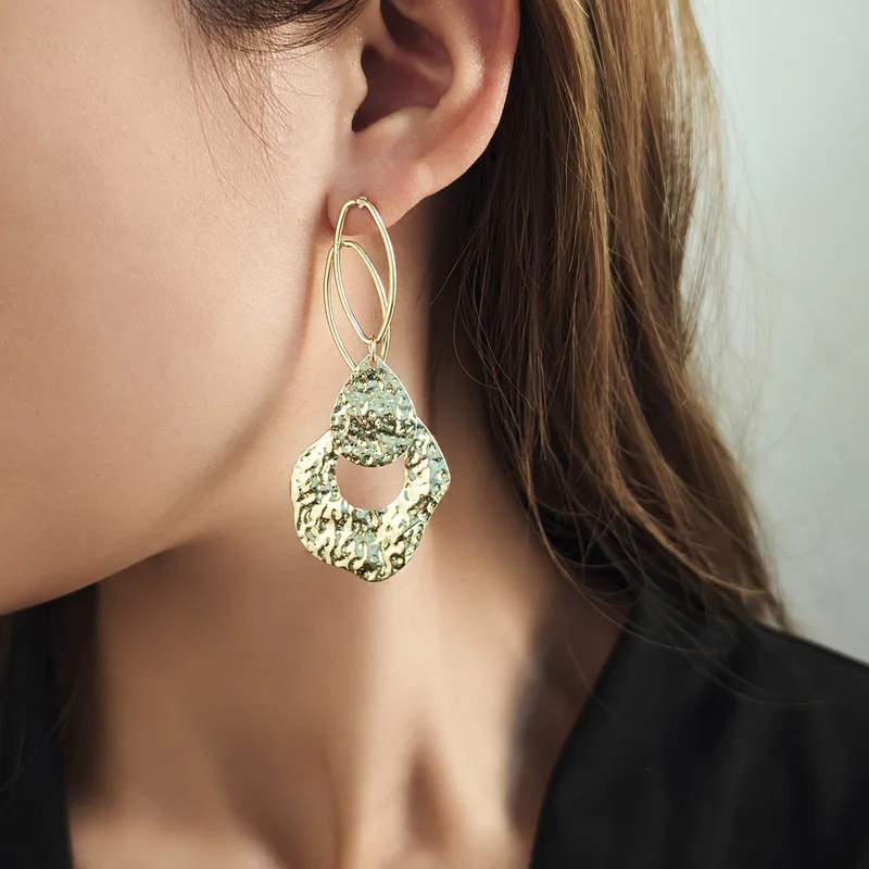 Make a bold statement with these Exaggerated Punk Geometric Pleated Iron Drop Earrings. Their edgy design and unique shape will add a touch of avant-garde fashion to any outfit. Elevate your style with these striking statement pieces.